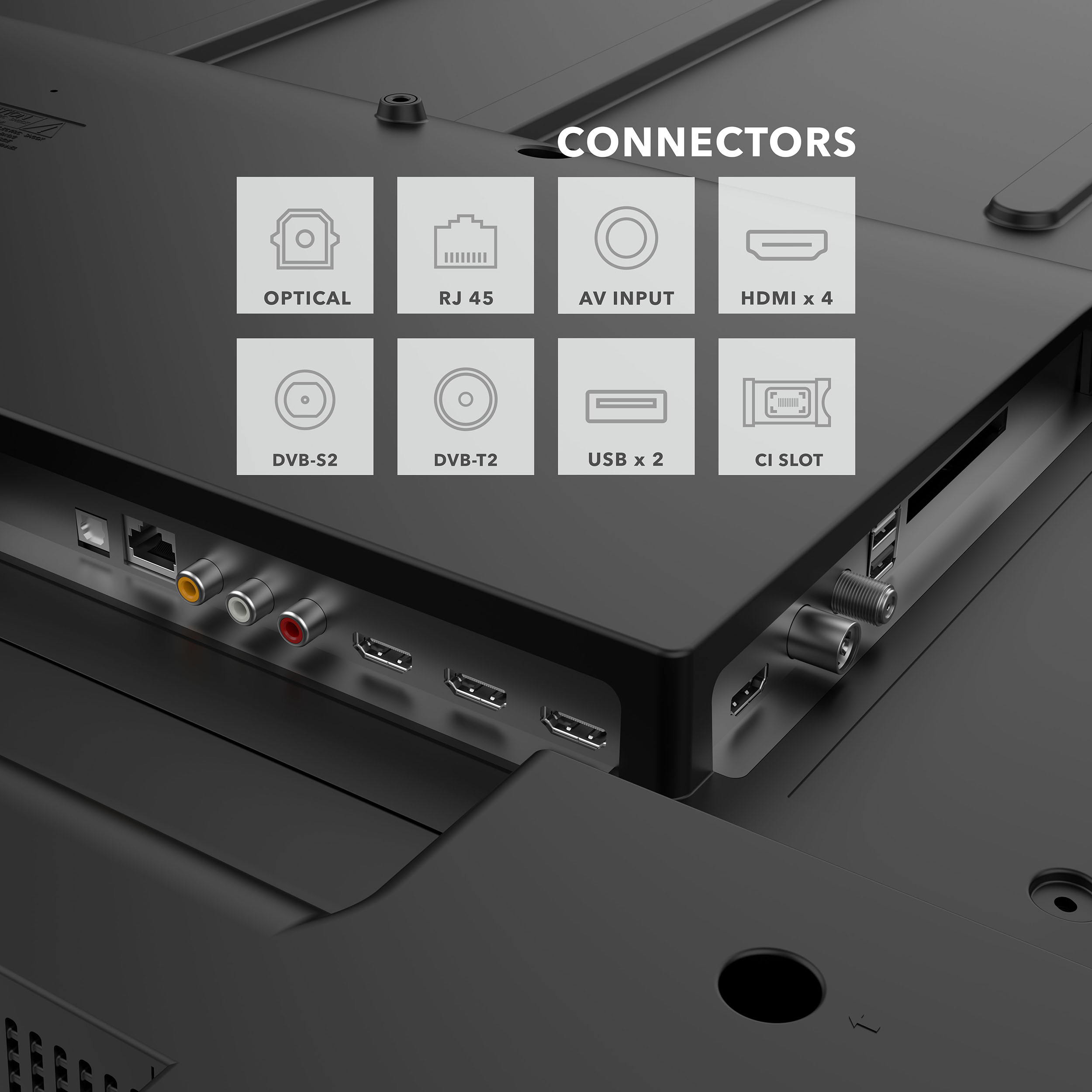 • Connectiques: 2 ports USB, 4 ports HDMI 2.1, Ethernet, WIFI, Bluetooth, CI+, 1 Port Optique